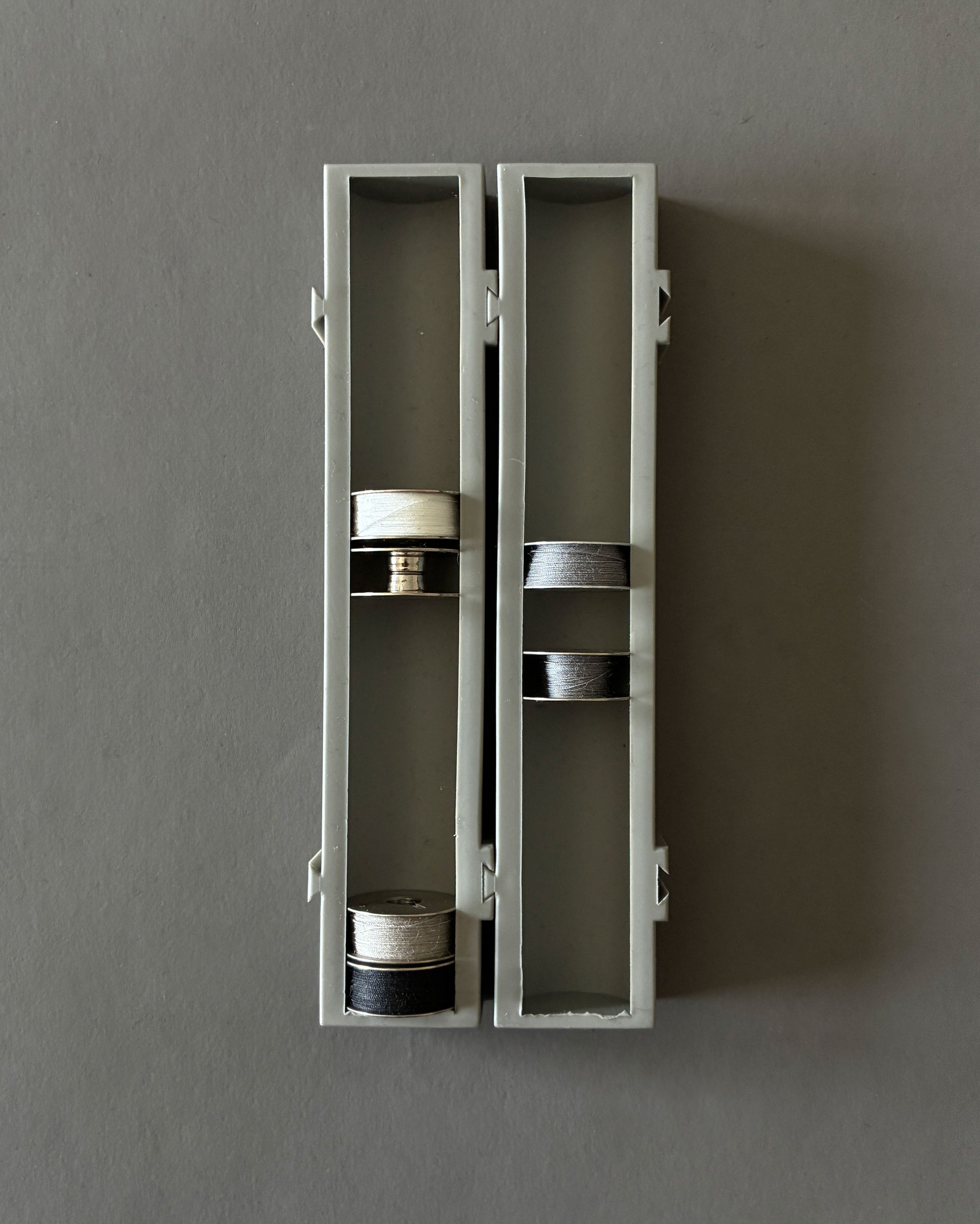 Can hold 12 plastic domestic bobbins, or 16 metal industrial bobbins. The silicone is moulded to prevent bobbins from falling out, even when thrown or turned upside down. It also has two dovetail joints on its side, so multiple bobbin holders can be connected.